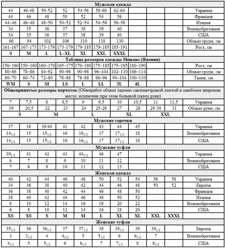 Міжнародні розміри одягу та взуття, по стандартам різних країн